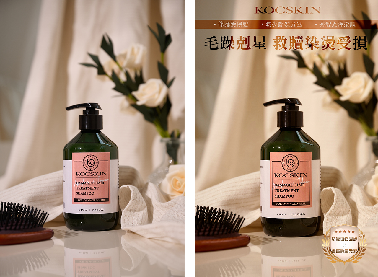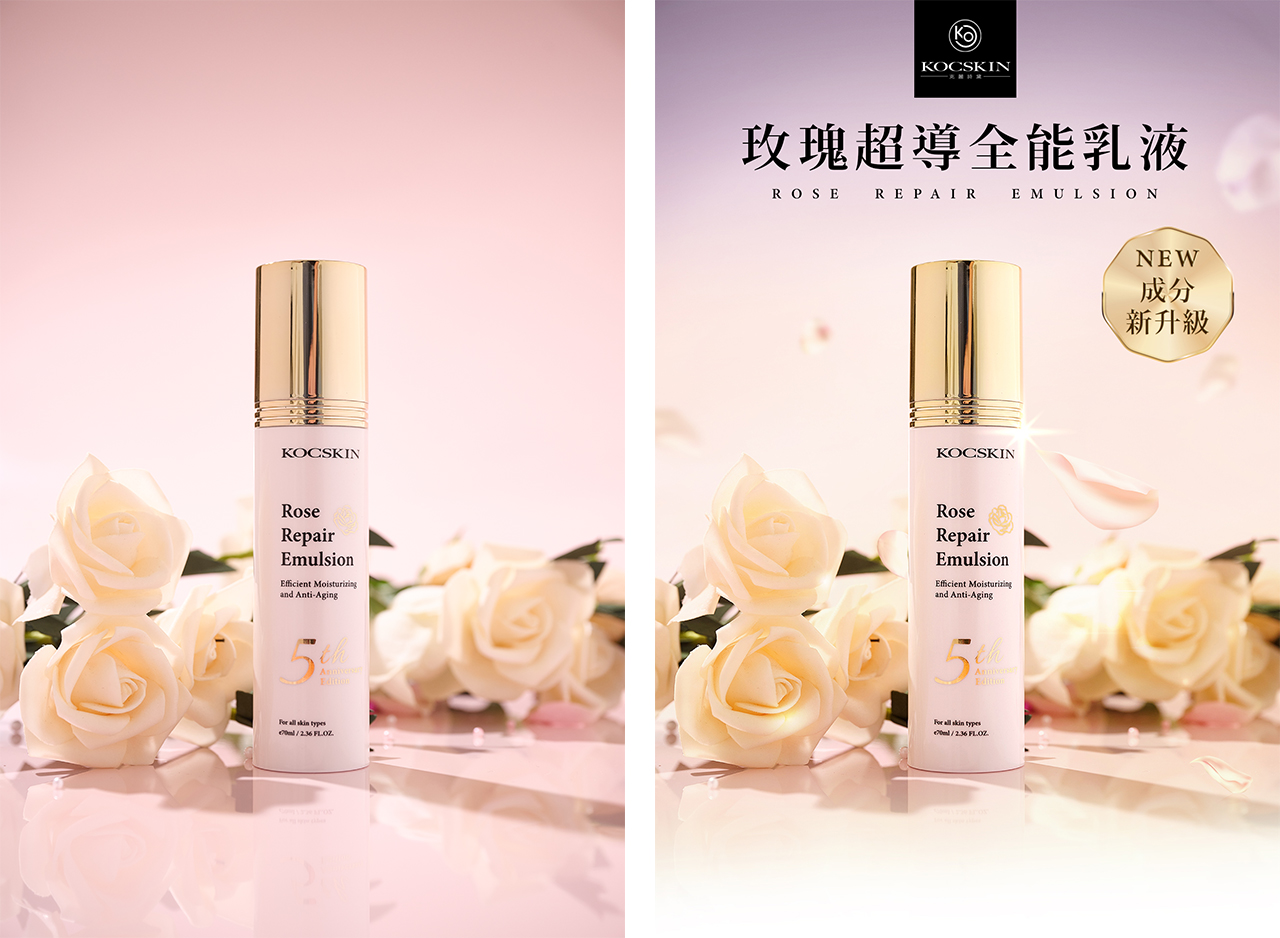 左:拍攝效果已如預期,僅調整更暖色調增加溫馨感。 右:產品拍得太透亮了故調整了瓶身飽和度與整體色彩增添粉色調以符合產品香調色。