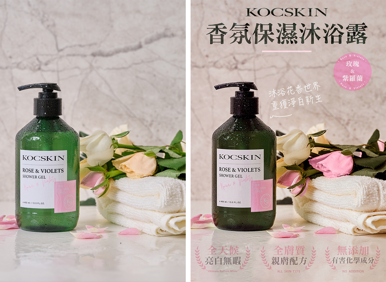 拍攝後認為整體色彩有點太單一性容易膩,加上了一些對比色紫色讓產品更突出,也讓整體色彩更溫柔和諧些。