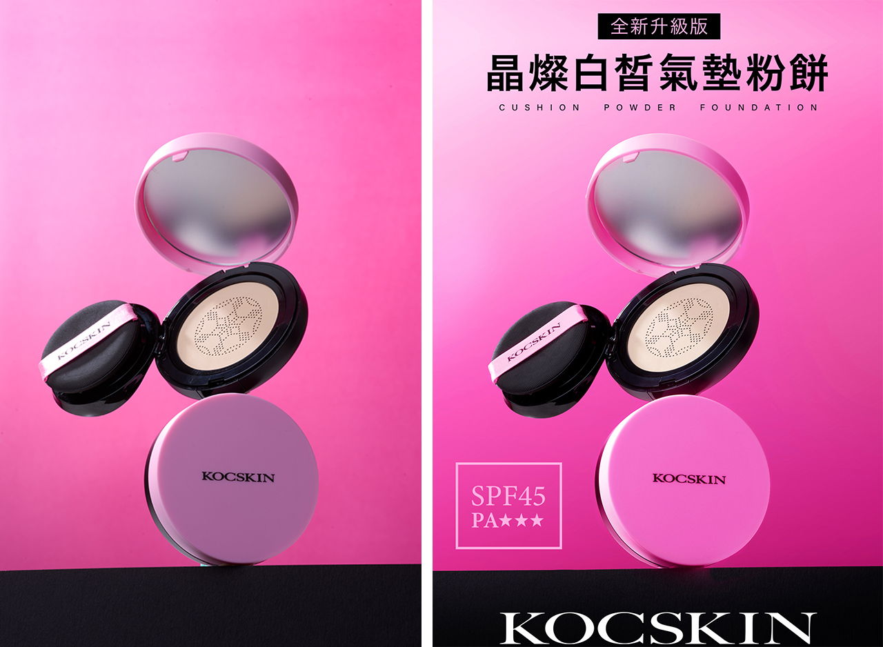 拍攝效果讓產品的粉色有許多我覺得過於灰暗的部分,背景色彩也不夠乾淨整齊,故我重新拉了新漸層背景,並將所有粉色的灰暗區做提亮飽合,讓產品更加明亮乾淨。